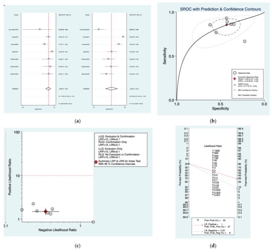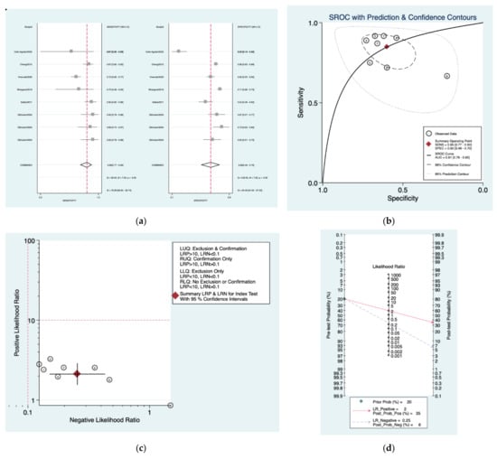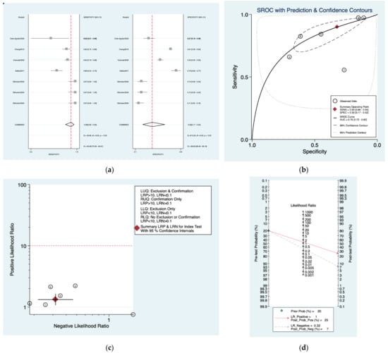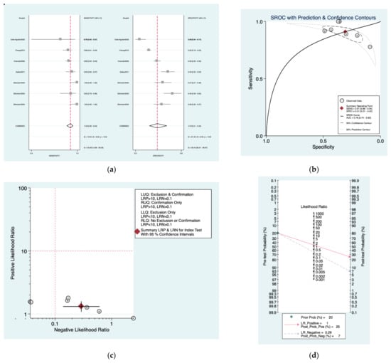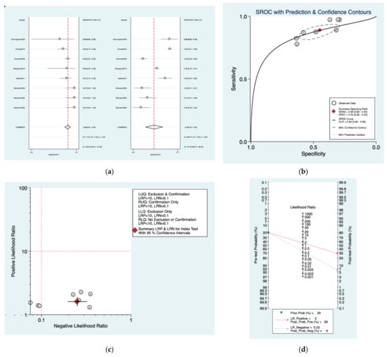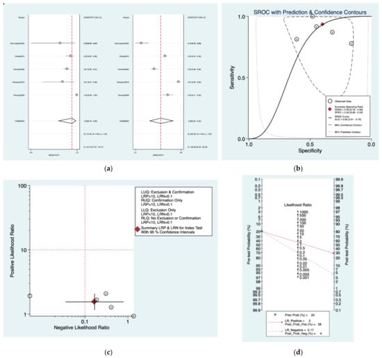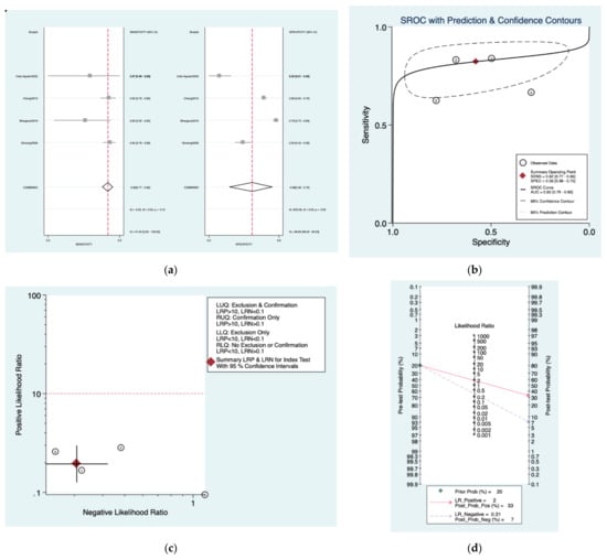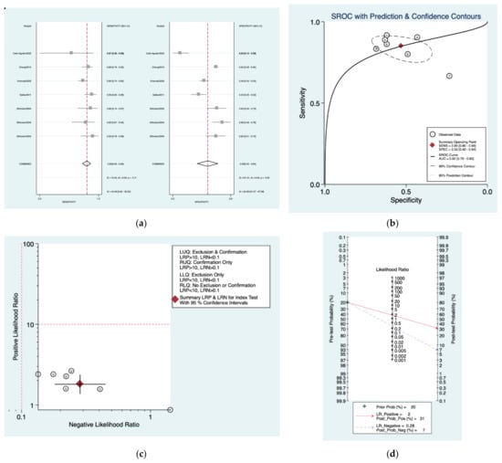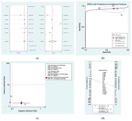 Meta-analysis of Sheppard protocol. (a) Forrest plot of pooled sensitivity and specificity [,,,]; (b) Hierarchical summary receiver operating characteristic (HSROC) curve; (c) Likelihood ratio scattergram; (d) Fagan nomogram.