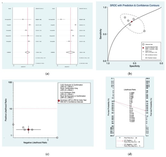 Meta-analysis of Schlauch and Levine protocol. (a) Forrest plot of pooled sensitivity and specificity [,,,,]; (b) Hierarchical summary receiver operating characteristic (HSROC) curve; (c) Likelihood ratio scattergram; (d) Fagan nomogram.