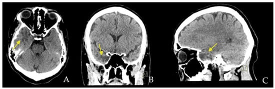 Brain CT in axial (A), coronal (B), and sagittal (C) planes reveals a hypodense area in the right temporal lobe with cortical and subcortical topography (yellow arrow), with partially lobulated contour, such as a cluster of hypodense nodules.