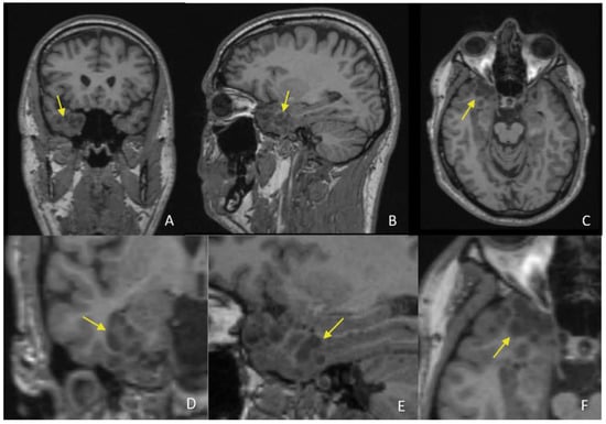 T1wi in coronal (A), sagittal (B), and axial (C) planes with correspondent zoomed images (D–F) on the temporal lesion reveal hypointense nodules (yellow arrow) at the cortical–subcortical white matter junction, some of them being clustered together.