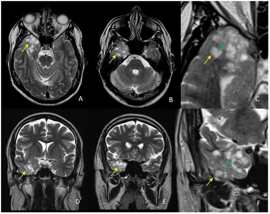 T2wi in axial (A,B) and coronal (D,E) planes with correspondent zoomed images (C,F) on the temporal lesion reveals hyperintense nodules (yellow arrow) at the cortical–subcortical white matter junction with areas of high signal intensity between them (green arrow).