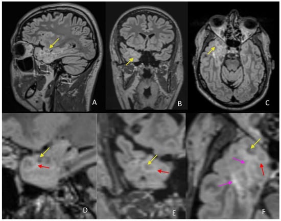 T2 FLAIR in sagittal (A), coronal (B), and axial (C) planes with correspondent zoomed images (D–F) on the temporal lesion reveals hypointense nodules at the cortical–subcortical white matter junction (yellow arrow) with a peripheral high signal intensity ring (red arrow) and areas of high signal intensity between them (pink arrow).