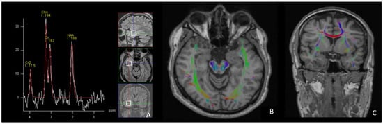 MR spectroscopy (A) shows a high choline peak and a lower N-acetyl aspartate peak. Tractography in axial (B) and coronal (C) planes shows disruption of the temporal stem fibers.