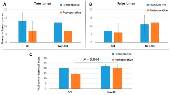The occlusion of intercostal arteries after FET has been reported as a risk factor for SCI by Kozlov et al. [15]. Hori et al. described significant spinal cord perfusion from intercostal arteries originating from the false lumen as a significant risk factor for SCI [3]. In our analysis, patients who developed SCI suffered a relevant postoperative decrease in the number of total patent intercostal arteries, but the number of vessels originating from the false lumen and the postoperative decrease in arteries originated from the true lumen were not statistically related to SCI (Figure 1). Furthermore, the extension of false lumen thrombosis has also been related to the development of SCI. All four SCI patients had a thrombosis extension up to at least zone 5. To this date, there are no reports analyzing the relationship of the extension of false lumen thrombosis after FET and the incidence of postoperative SCI.