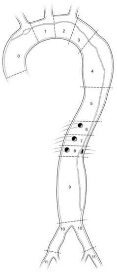 The preoperative and postoperative patency of the intercostal arteries is shown in Figure 1. There was no statistically significant difference in the number of total patent intercostal arteries prior to surgery, including those originated not only from the true lumen but also from the false lumen, between the two groups. (SCI, 20.5 (18.4–22.6) vs. non-SCI, 22 (19.8–24.2); p = 0.52). However, the reduction in the number of total patent intercostal arteries after FET was associated with postoperative SCI (SCI, 14.5 (10.4–18.5) vs. non-SCI, 20.5 (17.2–23.8); p = 0.04). The postoperative reduction in the number of patent intercostal arteries originated from the true lumen showed no statistical significance (SCI preoperative, 13 (7.4–18.6) vs. non-SCI preoperative, 12 (6.2–17.8); p = 0.88; SCI postoperative, 7 (4.3–9.7) vs. non-SCI postoperative, 7 (1.7–12.3); p = 0.66). Likewise, the postoperative reduction in patent intercostal arteries originated from the false lumen showed no statistical significance (SCI preoperative, 7 (4.2–9.8) vs. non-SCI preoperative, 11 (5.2–16.8); p = 0.41; SCI postoperative, 6 (0.3–11.7) vs. non-SCI postoperative, 12 (5.7–18.3); p = 0.13). The Figure 2 shows aortic dissection with aortic zones according to Ishimaru classification (0–11) [7]. Figure 3 (CT scan) shows occlusion of the false lumen and thrombosis of the intercostal arteries.