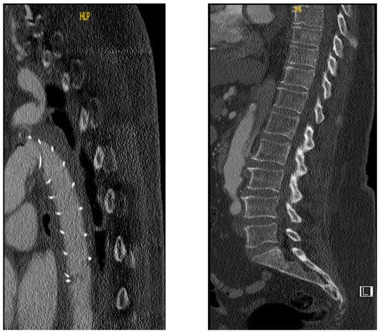 CT scans (sagittal view) of SCI patient. (Left): Proximal descending aorta after FET with two visible posterior intercostal arteries without contrast enhancement. (Right): Distal aorta of the same patient showing thrombosis of false lumen up to zone 9.
