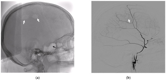 Lateral radiographic images without subtraction (a) and with subtraction (b). (a) The position of the 21” microcatheter in the MMA trunk (black arrow), and the white arrows indicate the radiological traces of the burr hole trepanation. (b) A lateral subtraction angiogram of the main trunk and branches of the MMA, where the black arrow indicates the position of the microcatheter, and the white arrow indicates the disturbed zone of the vascularization of the dura mater in the region of the burr hole trepanation.