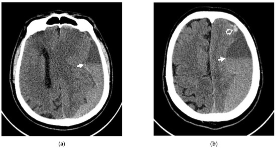 Axial NCCT scans of patient #1, showing rebleeding in the area of CSDH. (a,b) White arrows indicate the level of sedimentation of the fresh blood in the area of CSDH; (b) white frame arrow denotes the rebleeding area.