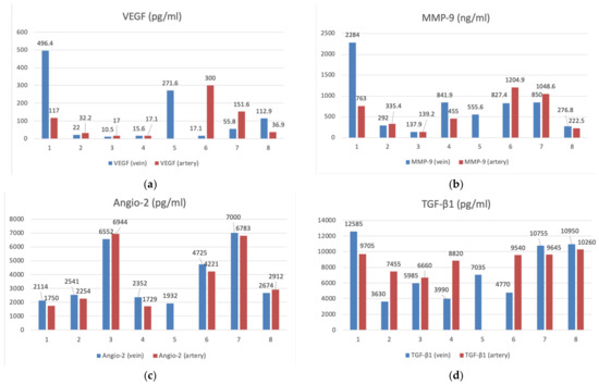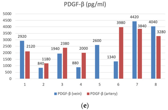 The mean concentrations (M ± SD/Me) in the arterial blood samples (n = 7) were 37 (pg/mL) for VEGF, 596 ± 416 (ng/mL) for MMP-9, 3799 ± 2259 (pg/mL) for Angio-2, 8869 ± 1327 (pg/mL) for TGF-β1 and 2683 ± 1042 (pg/mL) for PDGFβ-.
