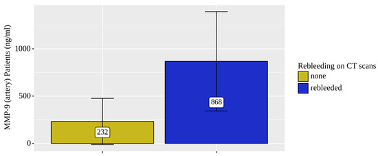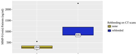 Only the concentration levels of MMP-9 were statistically significantly elevated in both the venous (p = 0.021) and arterial (p = 0.025) blood of patients who were diagnosed rebleeding based on the NCCT head scans (Figure 4 and Figure 5).