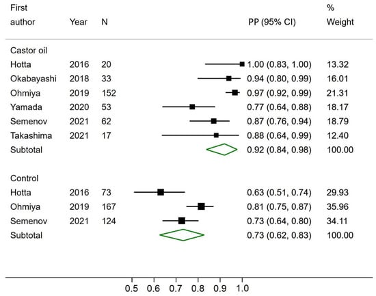 Forest plot of excretion rates of colon capsule endoscopy using castor oil in the bowel preparation regimen and in the control groups. PP—Estimated prevalence proportion.