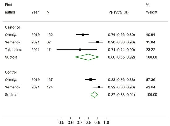 Two studies reported the PDR, one of which also had a control group for comparison. Therefore, no pooled estimates for DY were calculated. The PDR of CCE with castor oil was 82% in both studies and 44% in the only control group [,].