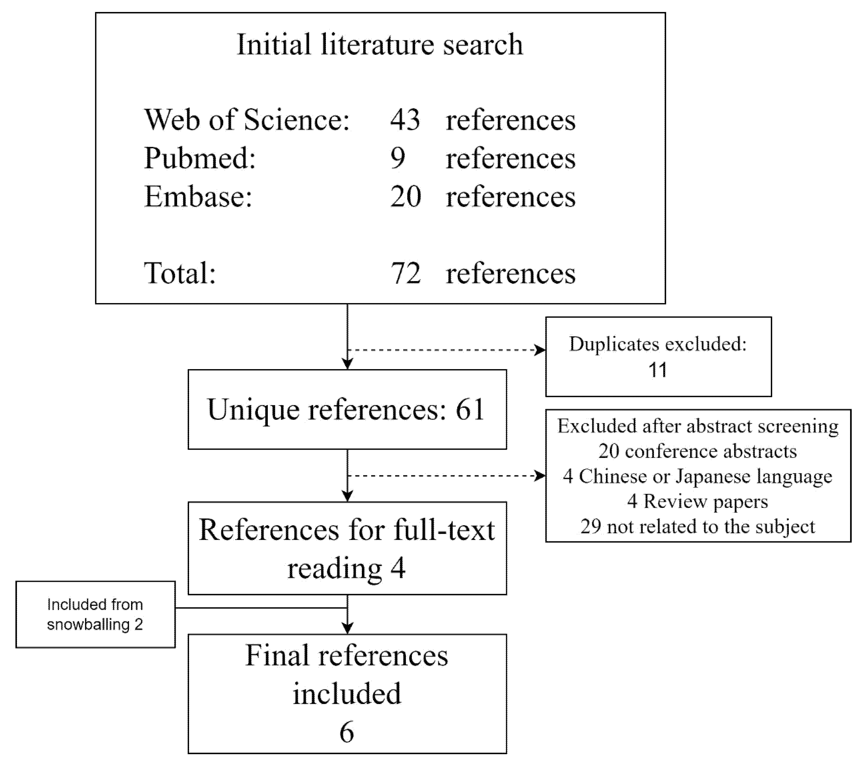 The initial literature search resulted in 72 references. Duplicates were removed (11 articles), and 57 articles were excluded after the title and abstract screening. After full-text reading of four papers, they were all included in the study. Thorough snowballing yielded two articles for screening abstracts, of which both were considered eligible for full-text reading and were finally included in the study (Figure 1). In total, six articles were included in this meta-analysis [,,,,,].