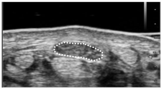 The diagnostic accuracy of ultrasonography was previously reported to be similar to that of the nerve conduction study []. Although ultrasonography alone has sufficient diagnostic accuracy, it has been pointed out that combining ultrasonography and nerve conduction study improves diagnostic accuracy []. Ultrasonography is less stressful on the patient and can identify neuromas or space-occupying lesions within the carpal tunnel, which could not be evaluated electrophysiologically. It can also identify a well-developed median artery and the compression of the median nerve associated with that arterial thrombus. In Nakamichi’s studies, space-occupying lesions were found only in the unilateral group (7/20 = 35%), and it is said that careful examination of unilateral carpal tunnel syndrome on suspicion of local pathology, especially space-occupying lesion, is important []. Prior confirmation of these findings is useful in selecting a treatment. However, device/examiner dependency on the visualization of peripheral nerves is a limitation of this technique [,]. Furthermore, swelling of the median nerve is difficult to detect in patients older than 80 years, regardless of their severity of CTS []. In addition, diabetic conditions are known to affect the size of the median nerve [,]. These factors should be considered when assessing median nerve size.