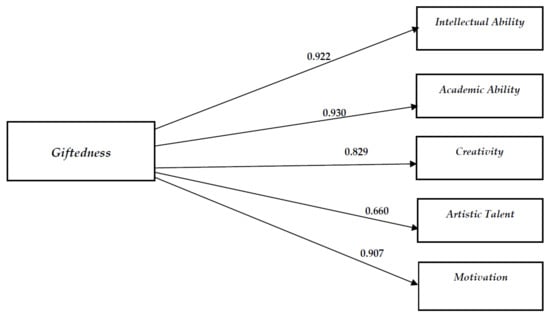 It should be noted that the aforementioned set of the CFA at the item-level data, although they fully verified the unifactorial structure proposed by Pfeiffer and Jarosewich [] for each of the five scales of the Greek version of the GRS-P, were limited as regards the identification of the number of the GRS-P organization’s underlying factors. Since the unifactorial structure for each of the five scales of the Greek version of the GRS-P was verified at the item-level data, and taking into account the finding of Benson and Kranzler [] at the scale-level data (not at the item-level data) that a general factor (latent variable) has been found to account for most of the variance captured by the five GRS-P ratings (measured variables), we followed Benson’s and Kranzler’s methodology []. In specific, we applied both an exploratory factor analysis (EFA) and confirmatory factor analysis (CFA), at the scale-level data, to all five scales of the Greek version of the GRS-P in order for us to be able to identify the number of their organization’s underlying factors (latent variables). Since both the EFA and CFA were not run at the item-level but at the total scores for the aforementioned verified factor structure of each scale of GRS-P, the intellectual ability, academic ability, creativity, artistic talent, and motivation scales were treated as measured (observed) variables first in the EFA, and then in the CFA that conducted the scale-level data.