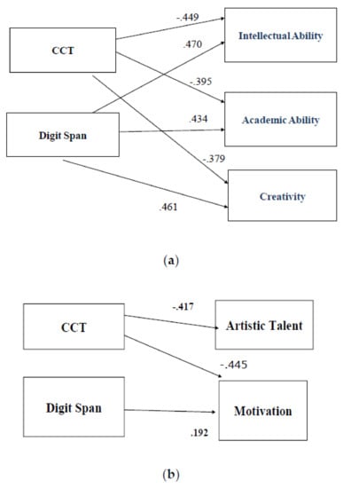 (a) The relations of the children’s category test and the digit span subtest to the intellectual, academic, and creativity GRS-P scales. (b) The relations of the children’s category test and the digit span subtest to the artistic talent and motivation GRS-P.