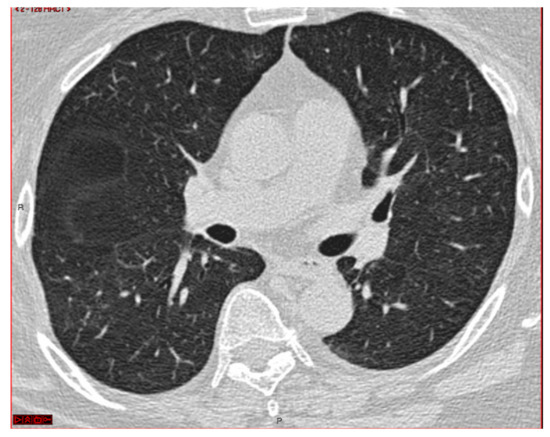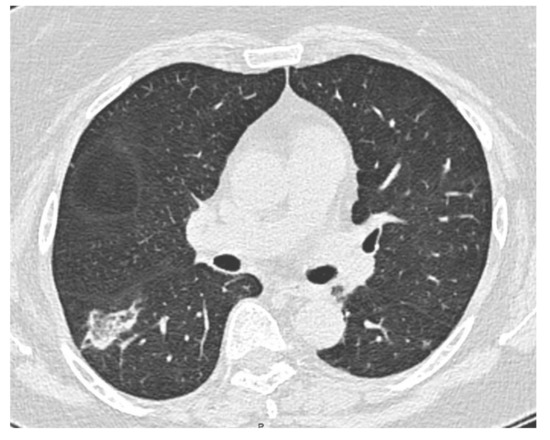 A 64-year-old female former smoker (20 pack-years) was admitted to the hospital of Reggio Emilia (Italy) for exertional dyspnea and a dry cough without a fever. The history of the patient included obesity (body mass index: 31 kg/m2), arterial hypertension and a pSS-ILD characterized by an NSIP radiological pattern. She had been on treatment for pSS-ILD for five years, initially with high doses of corticosteroids and subsequently with azathioprine, because of a relapse of the symptoms after the tapering of the steroids. Azathioprine was suspended 18 months before the hospital admission due to the appearance of myalgia and an intolerance of the patient to it. The percutaneous oxygen saturation with room air was 98% at rest and a thorax auscultation revealed a few crackles at the basal part of the right lung. The lung function tests and diffusing capacity for carbon monoxide were normal. A SARS-CoV-2 real-time PCR test and the sputum cultures were negative. The laboratory blood tests were normal, except for D-dimer (4230 ng/mL; cut-off: < 500 ng/mL). No sign of a lower limb venous thrombosis was found at the physical examination and at the point of care ultrasound. The echocardiography was normal and a computed tomography pulmonary angiography (Somatom Definition Edge, Siemens Healthineers, Erlangen, Germany) excluded a pulmonary embolism, but a new right lower lobe pulmonary opacity (35 mm and 15 mm diameter) was detected (Figure 1).