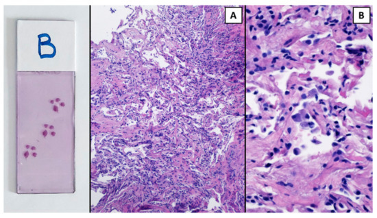 The procedure was performed in a hybrid operating room with Discovery IGS 740 Cone-Beam CT equipment (GE Healthcare, Chicago, IL, USA) under general anesthesia and through an endotracheal tube. A standard flexible video bronchoscope with a 2.0 mm working channel (BF-H190, Olympus Medical Systems, Tokyo, Japan) was used to administer the local anesthesia and to explore the bronchial tree. The endoscopic procedure was then continued with an ultrathin bronchoscope with the aim of better reaching the target lesion and performing the lung biopsies. This bronchoscope (BF-XP190 Olympus Medical Systems, Tokyo, Japan) had an outer diameter of 3.1 mm (at the distal end) and a 1.7 mm working channel. A CBCT acquisition was initially performed to define the target position and the easiest path to reach it was through the bronchial tree. Images were obtained by a 5 s rotational acquisition around the patient, who was kept in apnea in order to avoid CBCT reconstruction breathing-related artifacts. Subsequently, an interventional pulmonologist and a radiologic technologist segmented the volumes of interest, consisting of the target lesion and the path to reach it, using dedicated CBCT-augmented planning and guidance software (ASSIST, GE Healthcare, Chicago, IL, USA). The target and endobronchial path CBCT-based 3D volumes were then automatically fused on two-dimensional X-ray fluoroscopy imaging to augment the live guidance (Figure 2; see also Video S1 in the Supplementary Materials). The images were adjusted from the workstation to maximize the live fluoroscopy and augmented guidance visualization during the procedure. The target was identified in the apical segment of the right lower lobe (RB6) and an ultrathin bronchoscope was used to better reach the correct bronchus leading to the lesion. A 1.5 mm diameter mini-forceps tool was then pushed to the lesion and a second CBCT acquisition was performed to confirm it reaching the location. Tissue sampling was performed using the mini-forceps under augmented fluoroscopy guidance with seven transbronchial lung biopsies (TBLB) from the target lesion site. Afterwards, broncho-alveolar lavage (BAL) was performed. No procedure-related complications were observed. The microbiological and cytological tests on the BAL fluid were negative for common bacteria, fungi and malignant cells. The histopathological specimens consisted of 7 small fragments (maximum diameter of 2.1 mm) of pulmonary parenchyma. Four biopsies (slide B, Figure 3) showed well-expanded alveolar spaces, but demonstrated only two non-diagnostic incidental features related to the smoking habit of the patient: (1) mild respiratory bronchiolitis with a degree of finely pigmented macrophages within the alveolar spaces and respiratory bronchioles; and (2) mild hyaline interstitial fibrosis. Three biopsies (slide A, Figure 4) showed marked artifactual atelectasis, giving the false impression of hypercellularity and rendering the pathological examination difficult. The paraffin block of slide A was re-cut to obtain 5 deeper levels. Although the microscopic evaluation was difficult, a few intra-alveolar polypoid plugs of loose connective tissue with several lymphocytes and histiocytes were detected. A final pathological diagnosis of lung parenchyma with a few foci of organizing pneumonia was made. In combination with the clinical and radiological findings, a final diagnosis of organizing pneumonia in pSS-ILD was formulated. The patient received oral prednisone 50 mg daily for two weeks; this was then gradually tapered. Her symptoms quickly improved and the lung opacity gradually decreased and resolved at the CT scan follow-up performed 18 weeks after the beginning of the therapy (Figure 5).