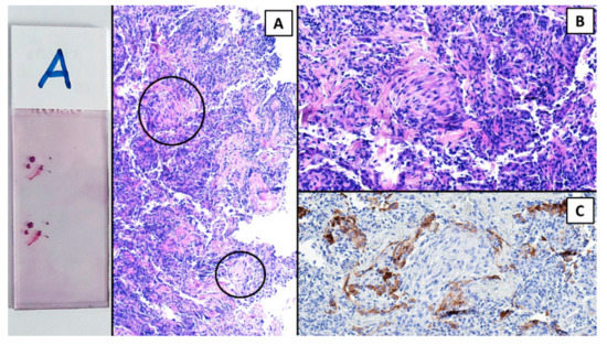 A CT-guided transthoracic needle biopsy can be used to perform the biopsy of lesions, but it is burdened with the risk of a pneumothorax, which ranges from 5 to 35% [22,23,24,25]. A fluoroscopy-guided transbronchial lung biopsy (TBLB) is a safe diagnostic approach to obtain lung tissue with a reduced risk of a pneumothorax (0.02–4.9%) [26,27,28]. The diagnostic performance of a TBLB in peripheral pulmonary lesions is highly variable and dependent on the lesion size and on the presence of a “bronchus sign” [28,29,30,31]; nevertheless, it can be considered to be the initial diagnostic procedure in most scenarios. Even if samples obtained are small biopsy specimens and the diagnostic adequacy of a TBLB remains debated, in the presence of a typical clinical and radiological picture, a histological pattern compatible with OP is sufficient to make the diagnosis [4,5,32]. During bronchoscopy, BAL can be performed; in patients with OP, it usually shows a mixed cellularity pattern with an increment in lymphocytes, neutrophils and eosinophils. The combination of histological and cytological results obtained from a TBLB and BAL can be crucial in a differential diagnosis, especially in the case of infections or a malignancy.
