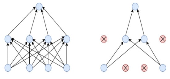 As we were working on the BCI-H&E dataset, which contains some misclassified data on the different stages of HER2 breast cancer, we applied several strategies to mitigate this bias problem, obtaining satisfying results. At first, we resized the H&E images to 299 ∗ 299 pixels, rescaled all images, and used data augmentation to get better prediction accuracy and overcome the overfitting problem. Next, we removed the default classification layer to perform four class problems. Then, we introduced global average pooling, replacing the flattened layer as it is more natal to the convolution structure because it drives correspondence between feature maps and categories. Moreover, it lessens the overfitting problem by decreasing the total number of parameters in the model. Finally, we experimented with diverse regularization techniques to improve model performance. We applied dropout regularization (0.3) [34] before each dense layer to prevent overfitting. Dropout drops randomly selected neurons during training, which helps the model accuracy gradually increase and decrease loss. Figure 3 illustrates how dropout works.