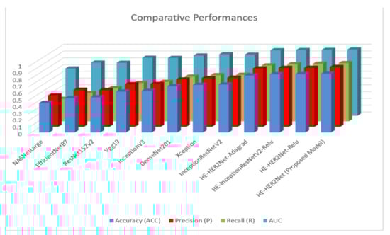 This column chart briefly describes comparative performances among all models. ‘HE-HER2Net’ is the proposed model.