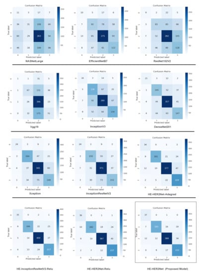 This broad figure shows the performance of the confusion matrix of all the models, including ‘HE-HER2Net’.