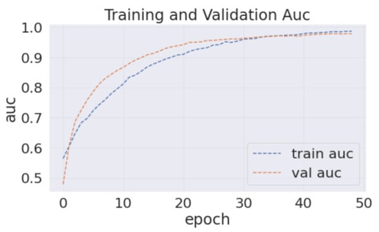 By visualizing the graphs shown above, our model performed exceptionally well. Though validation curves of accuracy, precision, and recall were higher than training accuracy, precision, and recall, our model initially faced a small underfitting problem. Later, the ratio between the training and validation curve started to decrease, which means that our model improved and learned well from the training data. Moreover, when validation loss starts growing, the model begins causing an overfitting problem. Several actions have been taken in our work to eliminate the underfitting and overfitting problems. First, we set early stopping by monitoring validation loss for three consecutive epochs by setting up patient three, which is why none of our models have an overfitting problem. From the loss graph, we see that the loss value for the training data was always slightly higher than the validation loss value, which indicates our model performed well without having any underfitting problems. By observing the precision and recall graphs, we see that the training precision and recall values were not higher than the testing precision and recall, indicating no underfitting problem in our model. Moreover, the AUC graph shown in Figure 9 was also obtained to observe our model. In addition, Table 3 describes the results of our model compared with other models.