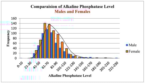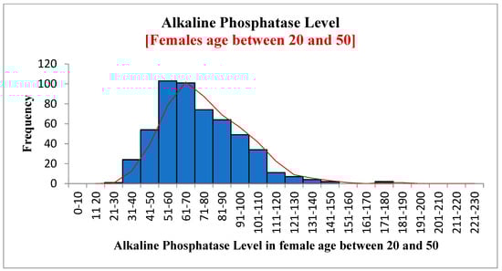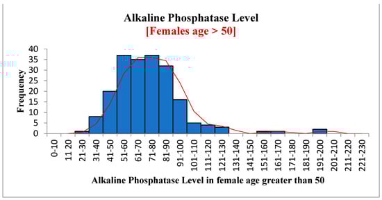 Figure 4, Figure 5 and Figure 6 show the frequency distribution of ALP in males and females, females between 20 and 50 years old, and females over 50. The mean ALP was 73.14 for all patients, 74.09 in males, 72.51 in females, 72.53 in females between 20 and 50 years old, and 72.45 in females over 50. There was no significant difference between these different groups. Statistics are available using the link given in the data availability statement.
