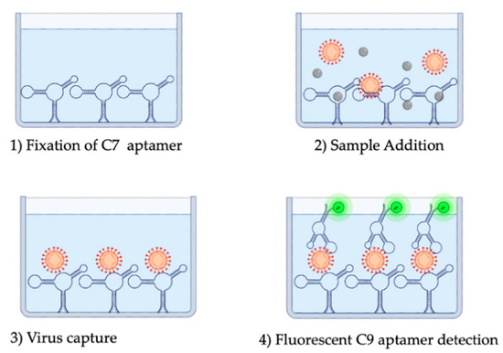 Fluorescence-linked C7/C9 aptamer assay (FLAA) was set in a sandwich-type detection system. Briefly, C7 was immobilized on the surface of maleic anhydride-activated 96-well plates as a capture agent. Samples were added to the C7-containing plates, incubated to allow SARS-CoV-2 capture and washed with the TNa7 buffer prior to the addition of fluorescein-labeled C9 as detection agent (FAM-C9) (Figure 1). After a second incubation, multiwell plates were washed and either read directly (black plates) or incubated with 7 M urea before fluorescence transference to black opaque plates.