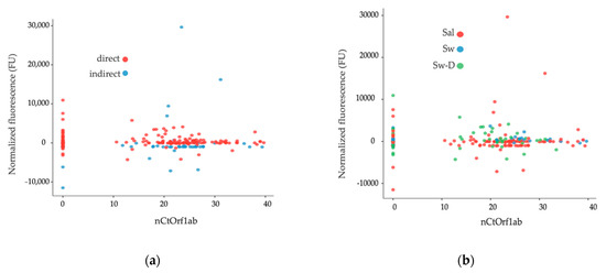 The distribution of fluorescence values with respect to nCtOrf1ab was analyzed in a scatter plot, distinctively indicating those acquired in each experimental protocol and sample type. Figure 2 shows the resulting plot as a duplicate but marked with colors according to each variable. It can be seen that most of the samples that were read with the direct technique have positive fluorescence values and are apparently comprised within a range of nCts between 15 and 30 (Figure 2a). On the other hand, samples processed with the indirect protocol showed low acquisition signals at FLAA, despite belonging to the same Ct range. Regarding the sample types, fluorescence values from swabs preserved in DMEM (Sw-D) corresponded to a more heterogeneous series of nCtOrf1ab (green dots) as compared to saliva (red dots) and swabs in TNa7 (Sw, blue dots) (Figure 2b). It can also be seen that the fluorescence of Sw samples corresponded to amplifications after cycle 20.