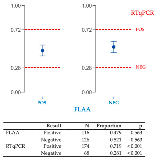 From this table, a number of true positives (92), true negatives (43), false positives (25) and false negatives (82) were obtained and then the contrast parameters were estimated as described in Material and Methods (Equations (2)–(6)). Globally, the sensitivity of the FLAA test was close to 53% while it had an approximate specificity of 63%, that is, it is a better system for the correct detection of negative cases rather than positive ones, and it performs with an accuracy of 56%. In contrast, the positive and negative predictive values (79% and 34%, respectively) and the positive and negative likelihood ratios (1.43 and 0.745), showed that the magnitude of improvement in the diagnosis of positive cases by RTqPCR could be increased 1.4 times when FLAA test also results in positive cases (Table 2).