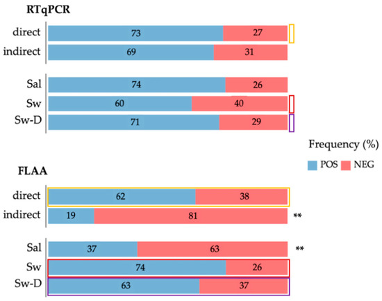 Using a similar analysis, the proportions of positive and negative cases were broken down and expressed as percentages in frequency plots (Figure 4) for each experimental condition used. The proportions of positive and negative cases were classified with RTqPCR, which correspond to the ideal result, are shown in the upper panel and the FLAA classification can be seen in the lower panel. Again, bars in the FLAA test should be as similar as possible to those in the RTqPCR. It can be seen that the proportion of FLAA in the direct protocol is more similar to that of RTqPCR (yellow rectangle), while the swab samples (red rectangle) are better than those of saliva with a slight advantage of the D-swab (purple rectangle) (Figure 5).