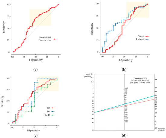 ROC curves for (a) overall samples; (b) protocol; and (c) sample type. (d) Fagan nomogram for post-test probability of positive (red line) and negative outcomes (blue line). Yellow squares delimit cutoff zones with high sensibility and specificity.