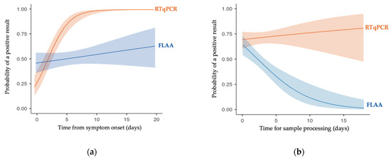 To evaluate such an effect, binomial logistic regressions were performed for both FLAA and RTqPCR, and graphs of estimated marginal means were constructed. The probability of obtaining positive results was contrasted to time periods and it can be seen that, in this particular set of patients, the probability of positive RTqPCR results increased gradually and reached the maximum values apparently around 6–7 days after symptoms onset (Figure 6a). This behavior also occurs for the FLAA test but in a moderate way (Figure 6a). Meanwhile, the probability of RTqPCR remained practically constant at all times and noticeably decreased for FLAA even from the first storing day (Figure 6b). These results confirm that extracted nucleic acids are better preserved than proteins when frozen and that, in the case of the C7/C9 aptamer detection system, immediate sample processing might be beneficial.