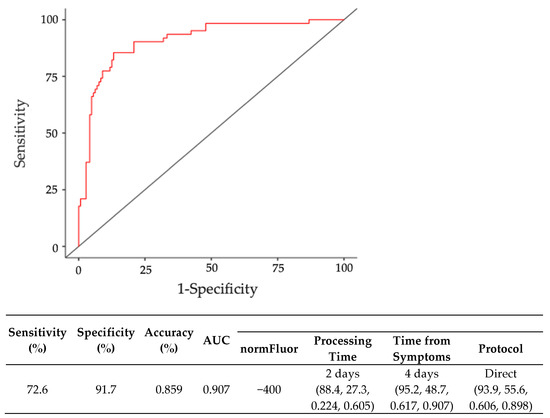 Based on previous observations, optimal cutoff points for aptamer performance were obtained from a recalculated ROC curve (Figure 7) using normalized fluorescence, symptoms onset and processing times as covariates; and protocol/sample types as factors. Figure 8 shows that AUC increased up to 91% when using the following conditions: samples should be obtained within the first 4 days of symptoms onset using nasopharyngeal swabs, preserved in TNa7 and processed no more than two days from collection. Additionally, the discrimination cutoff for accurate diagnosis should be considered at −400 FU, after a direct reading on opaque black plates.