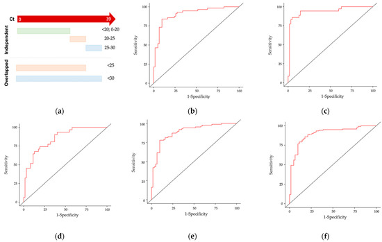 Recalculated ROC curves categorized by nCtOrf1ab ranges. (a) Scheme of Ct ranges used for curves adjustment, Red arrow: Ct scale, for independent, green bar: <20;0–20, pink bar: 20–25 and blue bar: 25–30; for overlapped, pink bar: <25, blue bar: <30. (b) ROC curve for Ct = 20–25, (c) ROC curve for Ct = 25–30 (), (d) ROC curve for Ct < 20, (e) ROC curve for Ct < 25 and (f) ROC curve for Ct < 30. Red lines: ROC curves, Black lines: non-discrimination lines.