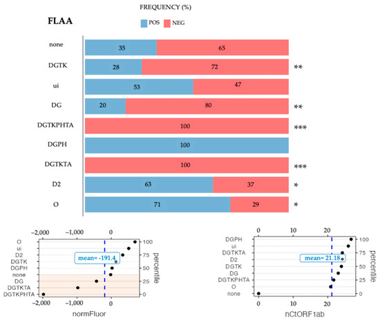 In contrast, the ratio was higher in samples with DG alone or combined with TK (DG = 28:72 and DGTK = 20:80). Samples detected with three or four substitutions involving TA were the ones with the greatest variation in FLAA results, rendering 100% of false negatives (Figure 9, upper panel). Additionally, it was found that a high proportion of positive samples do have not any of these mutations (unidentified, ui). The dot-plots for the comparison of mean fluorescence showed that the lowest acquired readings were registered for TA-positive samples as well as DG-alone mutants as compared to the rest of the combinations and also that negative samples were placed below the overall average (Figure 9, lower panel). Mean nCts for all mutants were found in a range of 21 to 22 cycles and all are located above the overall average.