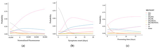 On the other hand, the estimated marginal means plots were obtained by logistic regression for each mutation (Figure 10), which were contrasted by normalized fluorescence, and by times from symptoms onset and experimental processing. The gray curves on all graphs were taken as the reference probability for RTqPCR negative results, and it was assumed that any curve depicted below it meant a lower probability of detection. Noticeably, curves for TA were found under the reference curve at all plots (Figure 10a–c). It is worth mentioning that such mutations (TA) were found in samples measured through the indirect protocol, which in itself, presents high false-negative rates. Notwithstanding, when compared to Omicron samples that contain all mutations but TA, it can be seen that there is also a moderate alteration in the aptamer-mediated detection (ratio 71:29, Figure 10a), despite the fact that it was detected in samples from the direct reading experiments. This may mean that, regardless of readout type, mutations could had influenced FLAA results.
