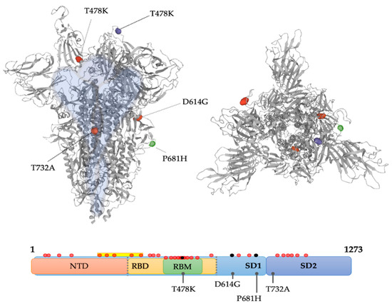 Tridimensional (PDB: 6ZGG) and linear representations of SARS-CoV-2 spike protein. Mutations T478K, T732A, D614G and P681H are presented as red, blue and green volumes. Red dots in linear drawing of S-protein represent sites of reported mutations for Omicron variant. Black circles are detected mutations shared with Omicron variant. Yellow rectangle corresponds to characteristic mutations of delta variant.