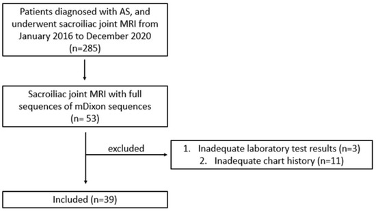 This retrospective study received approval from our institutional review board, which waived the requirement for informed consent. From January 2016 to December 2020, 285 patients who were clinically diagnosed with AS and underwent sacroiliac joint MRI were retrospectively recruited. The inclusion criteria were previous diagnosis of AS according to the Assessment of Spondyloarthritis International Society (ASAS) classification criteria for axial spondylitis and having undergone sacroiliac joint MRI containing full mDixon sequences (n = 53). Fourteen patients were excluded: five with inadequate laboratory test results and nine with inadequate medical records, preventing the ASDAS calculation. Clinical characteristics including age, sex, back pain severity, morning stiffness duration, global symptom duration, history of uveitis, and peripheral arthritis were investigated. Human leukocyte antigen-B27 positivity, serum ESR, and CRP levels were obtained from the patients’ electronic medical records. ASDAS-ESR and ASDAS-CRP were calculated at the time of the imaging study.