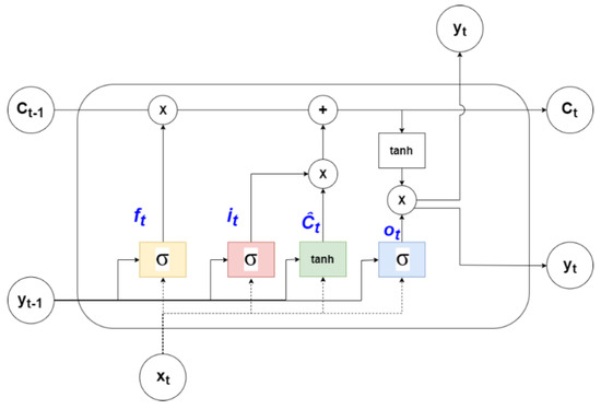 The memory of the LSTM cell is known as ‘cell state’ (Ct), which is then updated based on the output from ‘forget’ and ‘input’ gates, given by Equation (4).
