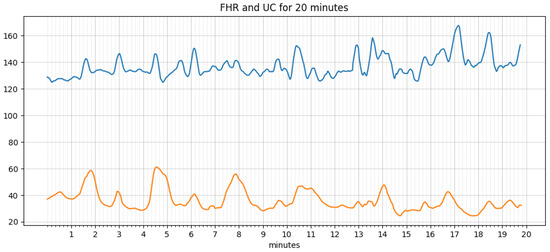 CTG data consist of four readings of FHR and UC collected every second during labor. The Phelps County Regional Medical Center provided over 8000 patients’ CTG data with their corresponding pH values. Forty-seven patients were diagnosed with acidosis; therefore, the dataset size was limited to 94 with even distribution of acidosis and non-acidosis cases to maintain the balance. An example of the raw data are shown in Figure 5. The cut-off point for differentiating acidosis was chosen as 7.2; all the values below 7.2 are considered acidotic, and the values above are non-acidotic.