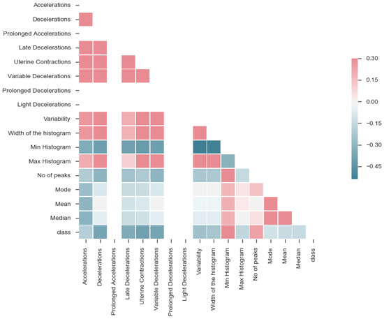 After extracting features, the correlation was performed to understand the complexity of the data. The correlation matrix for the data is shown in Figure 9. This visualization helped identify features, such as prolonged accelerations, prolonged decelerations and light decelerations, having no association with any of the features. Further analysis showed that these features appear in two samples only, thereby not influencing the classification. So, the features mentioned above can be removed.