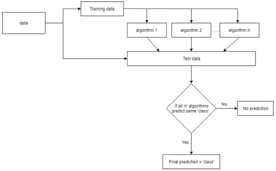 An ensemble algorithm is a technique to develop a better algorithm from a few weaker ones. The ensemble algorithm methodology is represented in Figure 10. The data were initially separated into training and testing data, and all the chosen algorithms were trained on the same data. The trained algorithms are evaluated individually on the test data. If all the algorithms predict the same class, the ensemble algorithm outputs the corresponding class, but if they do not predict the same category, the algorithm does not generate an output for that observation.