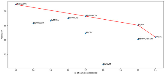 The two desired qualities are the number of samples classified and the performance. Figure 11 shows the 2-dimensional Pareto front for these objectives. It can be observed that NN/RF/Clu/SVM, NN/Clu/SVM, RF/SVM, and RF/NN are the non-dominated solutions. We chose RF/NN as the optimal combination with a reasonable trade-off between both objectives.