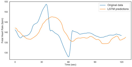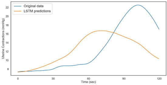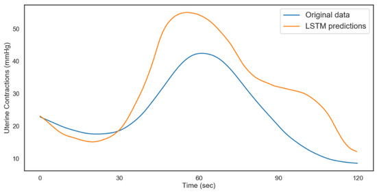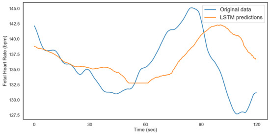 The model was validated on 480 time steps, which translates to 2 min (120 s). A total of 80% of the rest of the data was used for training the model and 20% for testing. The results from both models are shown in Figure 12 and Figure 13. Table 6 shows the performance metrics for the testing and validation of the algorithms. The better performance of the model for FHR during validation could be attributed to the distribution of data and the regularization technique (dropout) during the training. From the results, we can conclude that with ideal hyperparameters, LSTM can be a robust model for understanding and predicting CTG data.