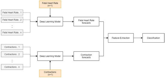 The methodology of the paper is shown in Figure 1. FHR and UC data for the patients are forecasted using a deep learning model (LSTM). Feature extraction is then performed on the entire time series and newly predicted data. These features are then classified using an ensemble algorithm, consisting of a random forest and support vector machine to obtain the future fetal state. The identified variables can improve the diagnosis and fetal-monitoring process by providing additional information to the obstetricians in advance for them to plan and implement necessary interventions.