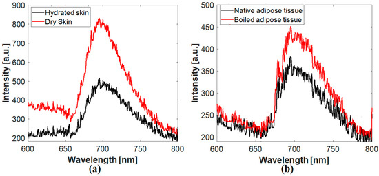 The fluorescence emission spectra of the examined samples. (a) Skin and (b) adipose tissue.