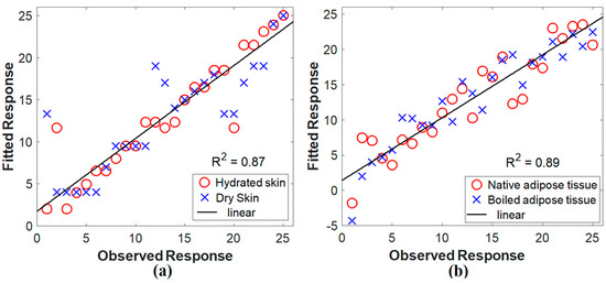 When there are various highly correlated and/or collinear predictor variables, PLSR is used to model the response variable. The technique creates new predictor variables, referred to as components, by linearly combining the initial predictor variables. It develops components to describe observed variability in predictor variables while accounting for the response variable. Through PLSR, the experimental measurements’ correlation was assessed. It is used to find the line that fits the dataset the best and ensure that the measured data is correlated and that no unusual values exist. The relationship between the actual and predicted values according to our measured spectroscopic data is shown in Figure 5. The model’s performance was good, as indicated by the calculated R2-values of 0.87 and 0.89 for skin and adipose fat tissue samples, respectively.