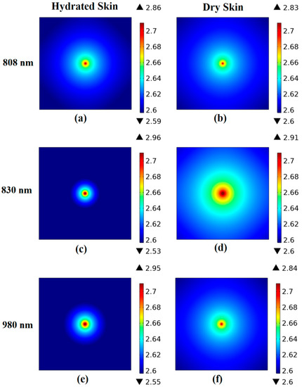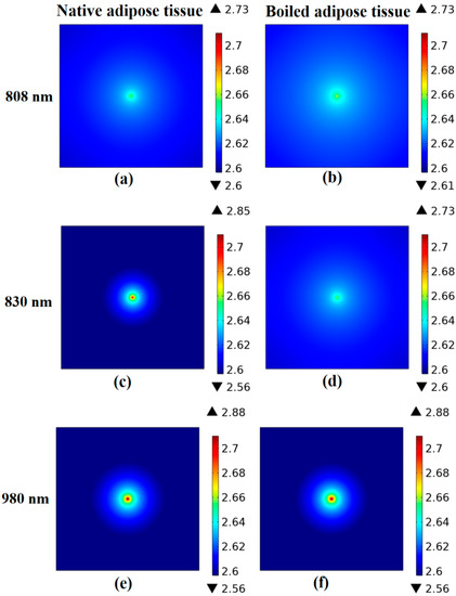 The fluence rate at the sample’s outer layer was determined using the finite element method. The results of skin and adipose fat tissues are displayed in Figure 6 and Figure 7, respectively. The minimum and maximum logarithmic values of the resultant fluence rate log() are shown within the color bar of the figures. These values differ with the tissue condition and the utilized wavelength. For example, the distribution of the optical fluence rate appears wider and more diffusive in the dry skin and boiled adipose fat samples. On the other hand, it is focused and collimated in the native tissues.